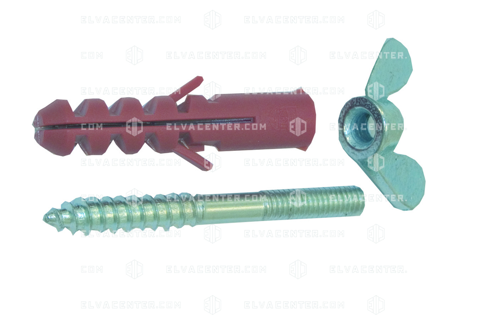 Fastening set type F for perforated sheets, consists of: 4x dowels 10x50mm, 4x hanger bolts M6 suitable for dowels, 4x butterfly nuts M6.